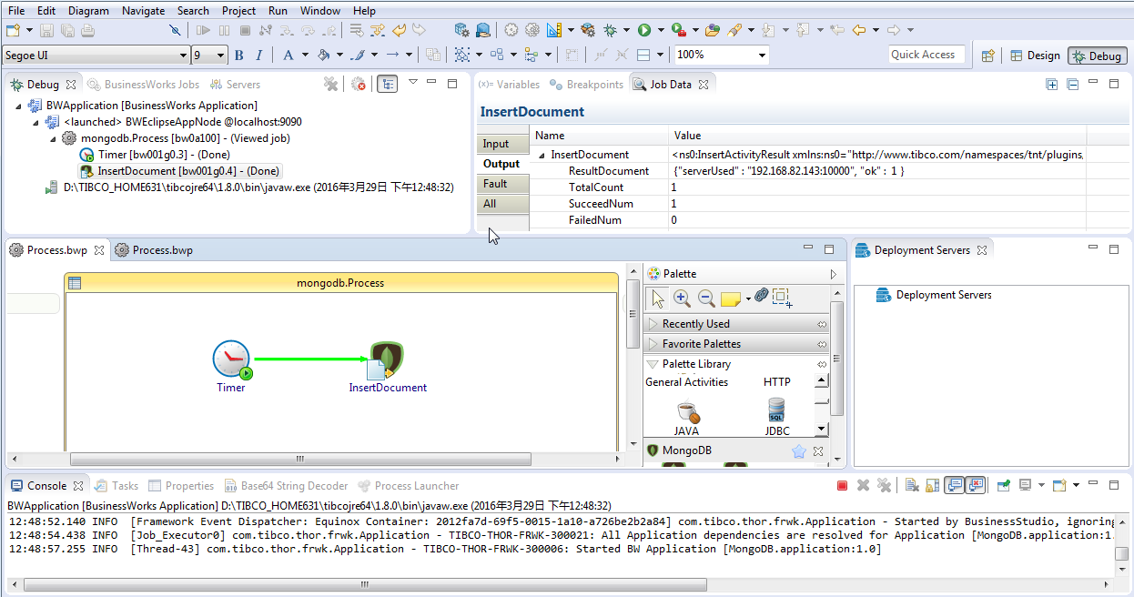 TIBCO Business Studio changes to the Debug perspective. The debug information is displayed in the