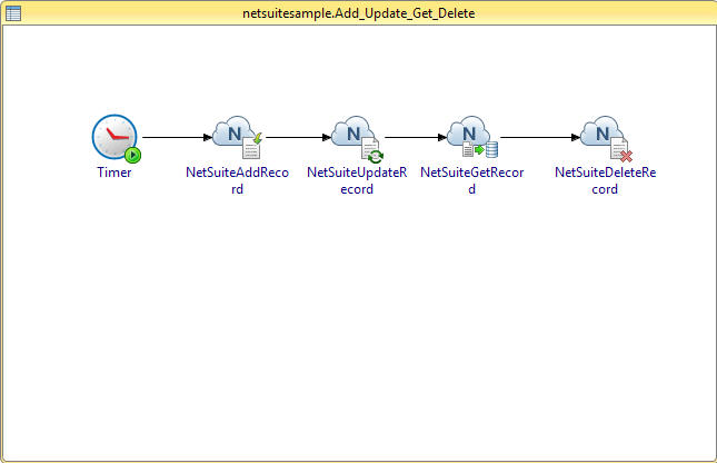 The Add_Update_Get_Delete process uses transaction activities to add, update, retrieve, and delete the CalendarEvent record from the NetSuite system.