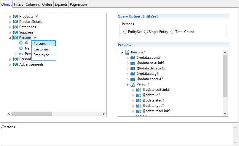 Resource type represented by tree nodes can be divided into 3 classes: Entity Set , Property and Navigation Property.