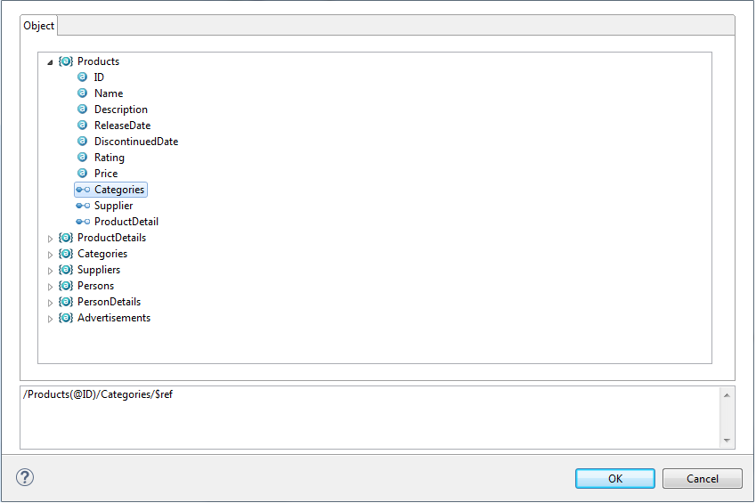 The Object panel in the URI Builder wizard lists all entity sets at the first level and shows entity properties and navigation binding properties in the second level.