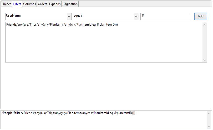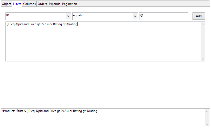 In the Filters tab, you can provide flexible query condition combinations for query URI option $filter. A meta condition is appended each time, and those meta conditions are arranged by an and relation automatically.