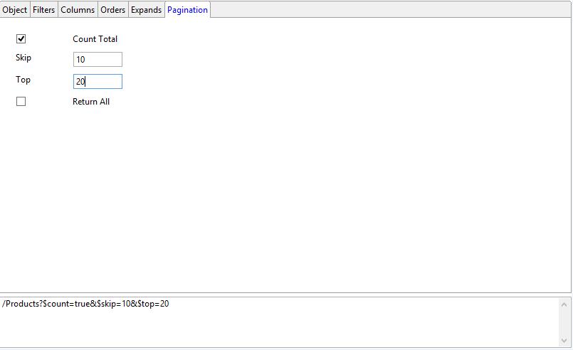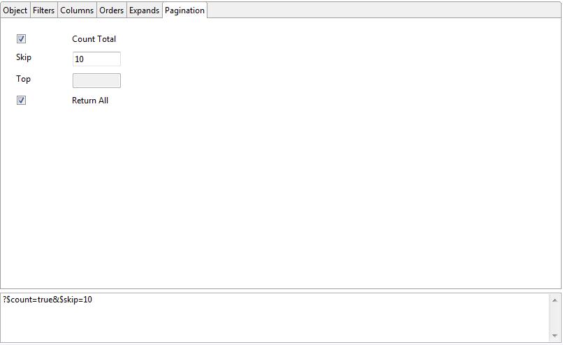 If the Count Total check box is selected, $count=true is appended to query URI at the bottom. Skip and Top fields set $skip and $top options respectively.