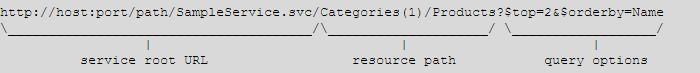 As OData official documentation illustrates, a URL used by an OData service has at most three significant parts: the service root URL, resource path and query options.