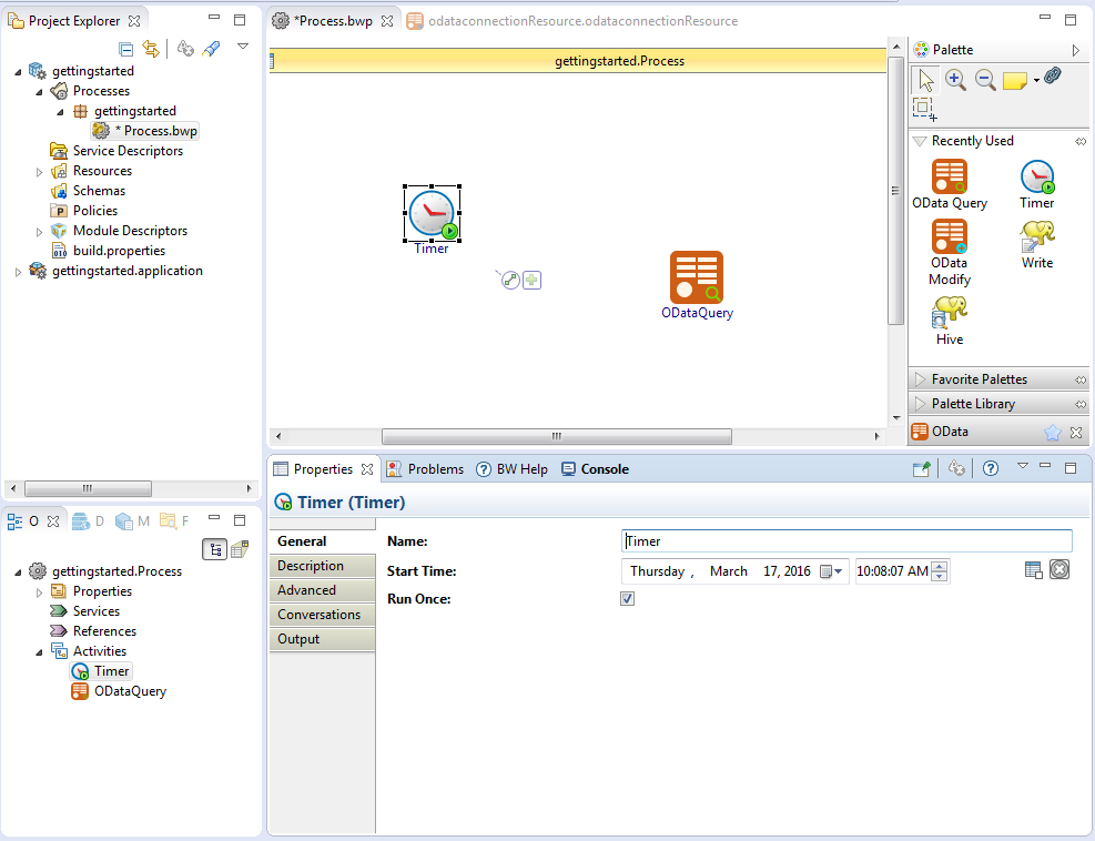 For example, select and drop the Timer activity from the General Activities palette and the OData Query activity from the OData palette.