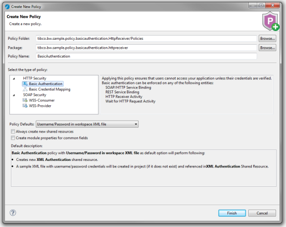 - Username/Password in filesystem XML file: Select this option to verify user credentials through an XML Authentication resource stored in your local file system. A new Basic Authentication policy configured for XML authentication is produced in your workspace: