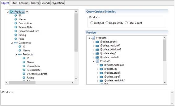 When an entity set node is expanded, the node is selected automatically, and all the properties and navigation properties belonging to the corresponding entity type are represented. The entity set node is expandable if the selected node represents a property that is a complex type or a navigation property.
