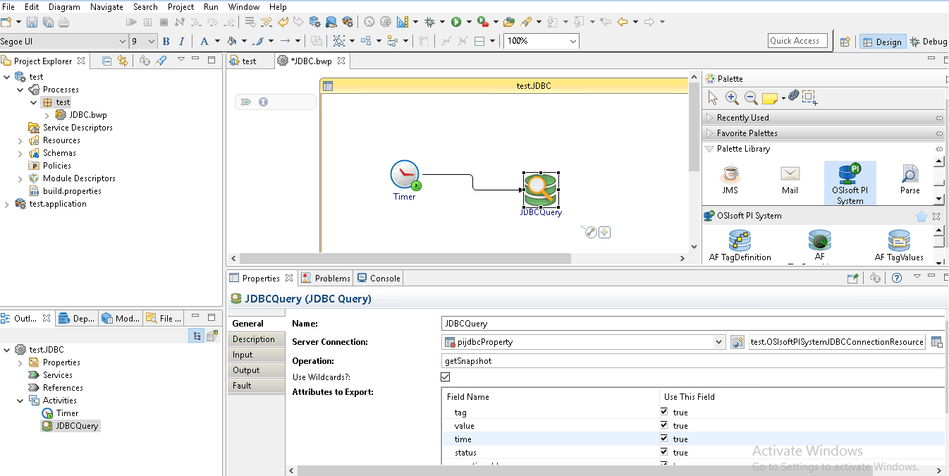 Ensure that you have created an empty process and an OSIsoft PI System JDBC connection. For more information, see Creating a Project and Creating an OSIsoft PI System Connection. If you have not created an empty process when creating a project, see TIBCO ActiveMatrix BusinessWorks Application Development for more information about how to create a process.