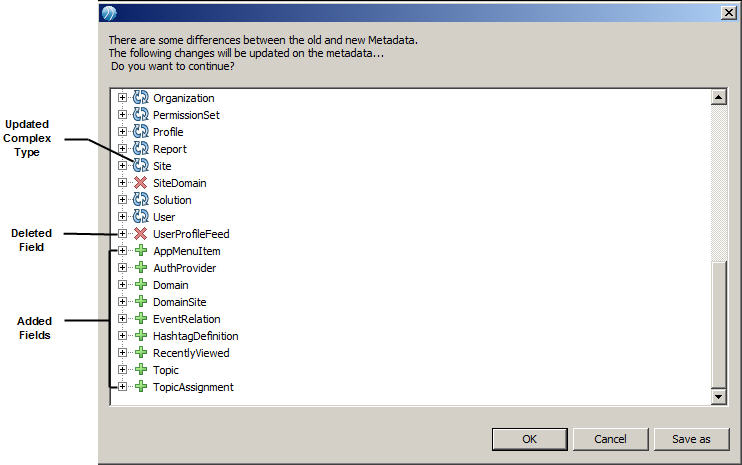If no update of the metadata on the Salesforce.com server is available, then just click the relevant buttons to finish the operation.If the metadata on the Salesforce.com server is different from the local metadata, a window opens, as shown in the following figure. Fields changed on the Salesforce.com server are displayed in the window.