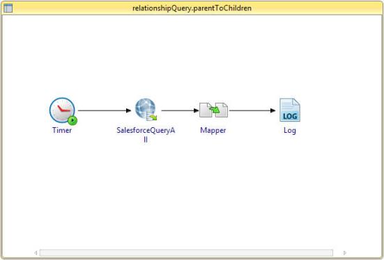 Processes the parent-to-child relationship query. The following statement is entered in the queryString field. Select Id, Name,BillingStreet, (select Id, FirstName,LastName from Contacts) from Account a where a.Name='TIB_Sample_TIB' and a.BillingStreet='TIB_Sample_TIB’ |