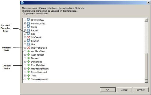 If no update of the metadata on the Salesforce.com server is available, then just click the relevant buttons to finish the operation.If the metadata on the Salesforce.com server is different from the local metadata, a window opens, as shown in the following figure. Fields changed on the Salesforce.com server are displayed in the window.
