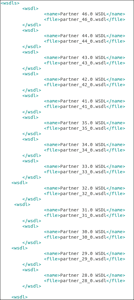 The default WSDL is defined in the first wsdl node in the SalesforceWSDLs.xml file, as shown in the following figure.