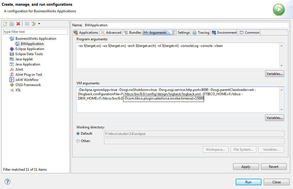 To conveniently configure the timeout value for the Salesforce activities running in TIBCO Business Studio, you can write the property line -Dcom.tibco.plugin.salesforce.invoke.timeout=15000 as shown in the following figure: