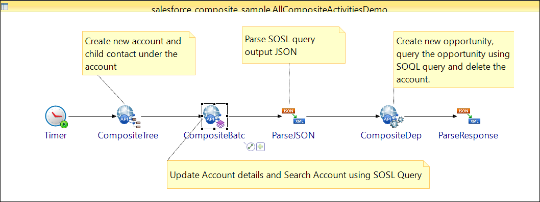 The AllCompositeActivitiesDemo process demonstrates how to work with the Composite activity palette in an