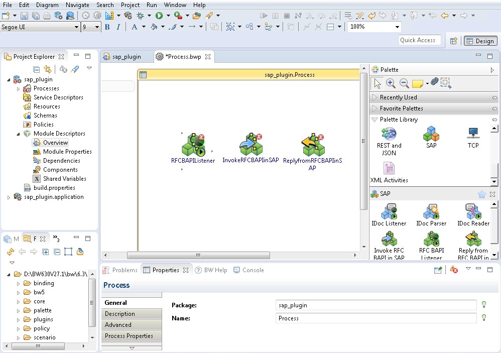 For example, select and drop the RFC BAPI Listener, the Invoke RFC BAPI in SAP, and the Reply from RFC BAPI in SAP activities from the SAP palette.