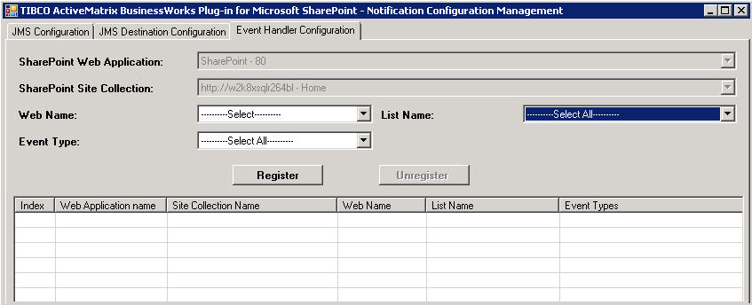 | Unregister | Click this button to unbind the event handler from the selected lists. If you select the Select All item from the List Name list, and check all the entries from the table, the event handlers are unbound from all the lists after clicking this button. |