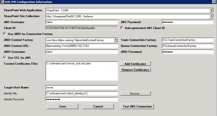 | Use SSL for JMS | (Optional) Specify whether you want to use SSL to support client authentication for the JMS server. If selected, you have to configure Trusted Certificates Path, Identity File, Identity Password, and Target Host Name fields. |