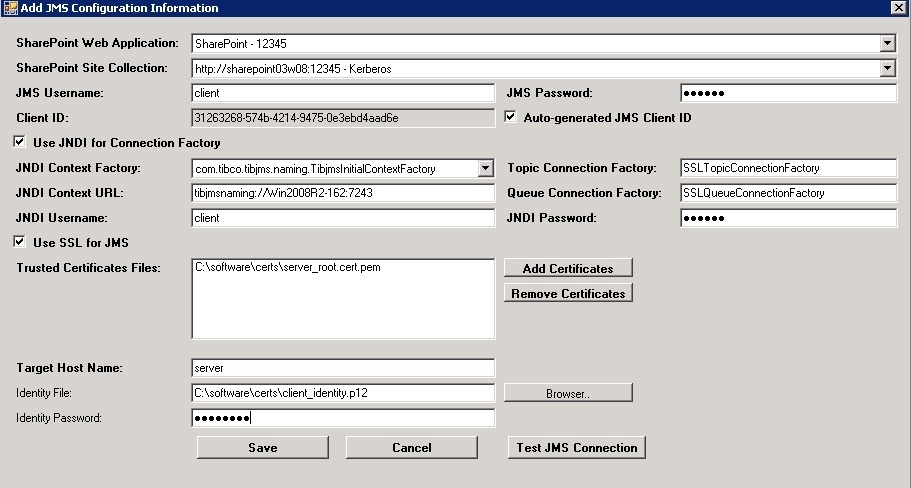 In the Add JMS Configuration Information window, you can configure the JMS connection information. After you complete the JMS connection configuration, the corresponding JMS and SSL configurations are stored in the Microsoft SharePoint server.