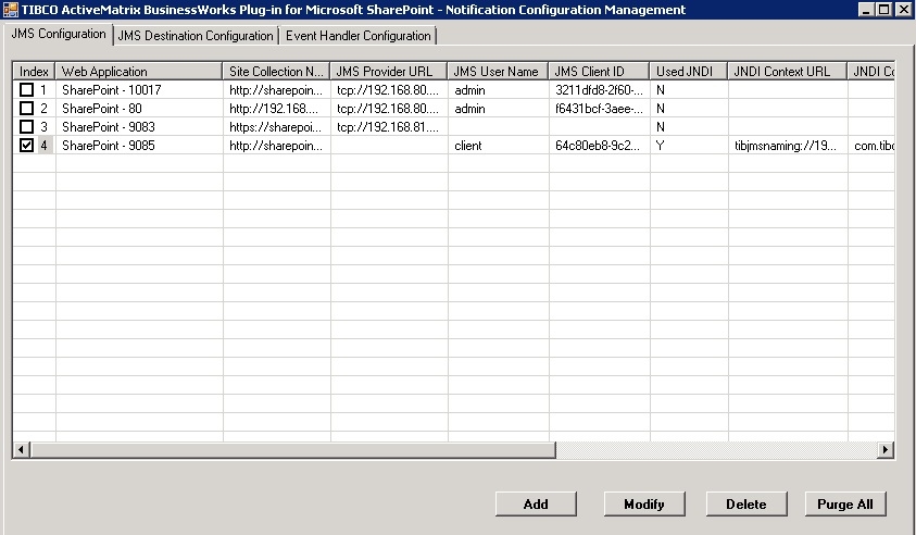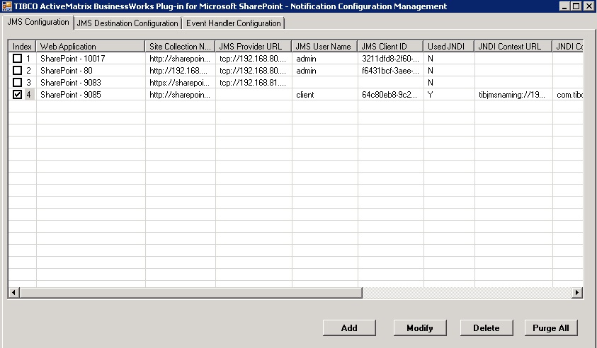 | Purge All | Click this button to purge all JMS configuration data by using the SharePoint Notification Configuration Management tool. |