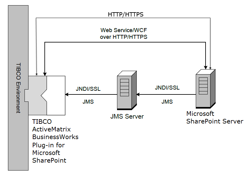 When the plug-in listens to events occurring in the Microsoft SharePoint server, the plug-in communicates with the Microsoft SharePoint server through the JMS server. The plug-in and Microsoft SharePoint server support using JNDI or SSL to communicate with the JMS server.