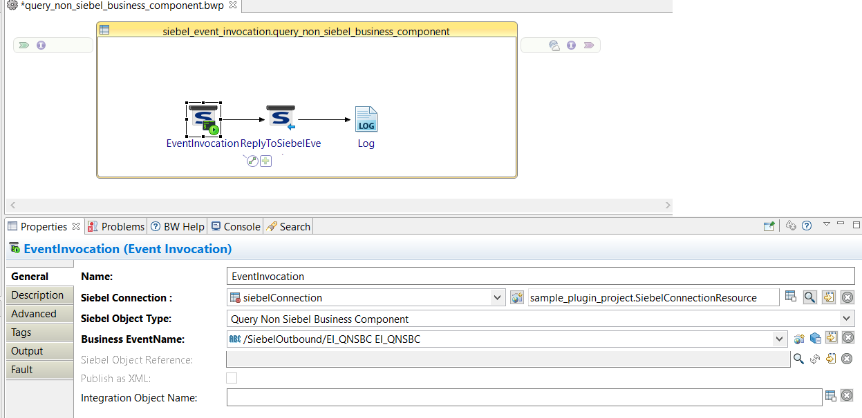 The EventInvocation activity listens to the data and displays the received data on the Output tab of as Name-Value pair. The ReplyToSiebelEvent activity sends the populated data as a reply to the Siebel Server. The Log activity is used for logging.