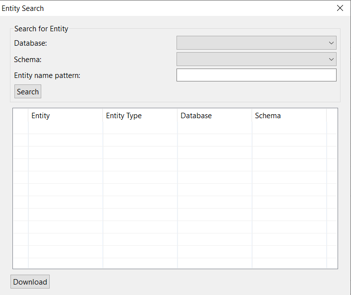 Entity Search page is displayed. You can search an entity here by selecting the database, schema, and entity name pattern.