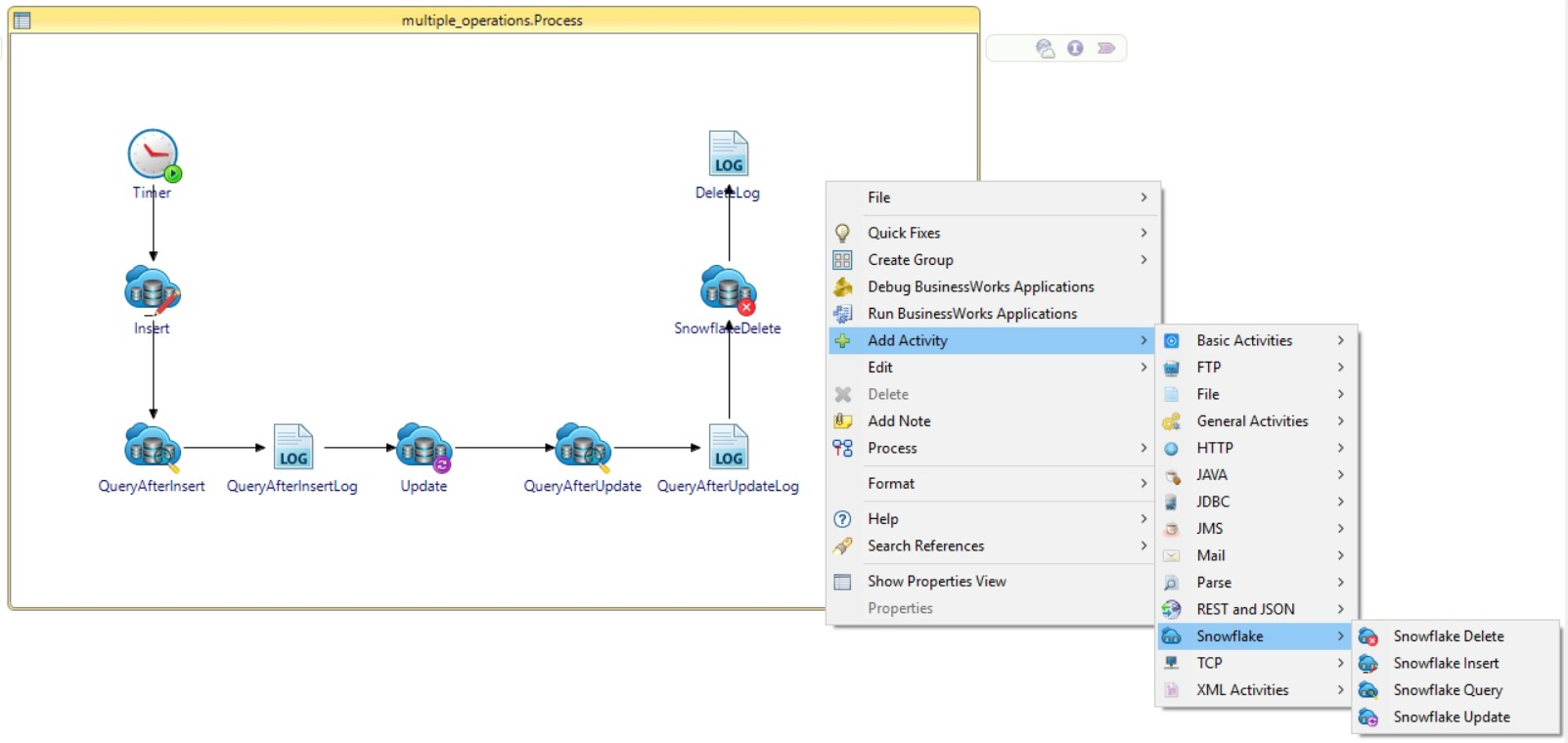 Note: A Snowflake Connection shared resource is required when configuring the activities. For details on creating the Snowflake Connection shared resource, see