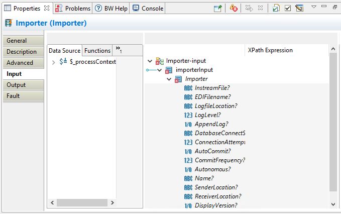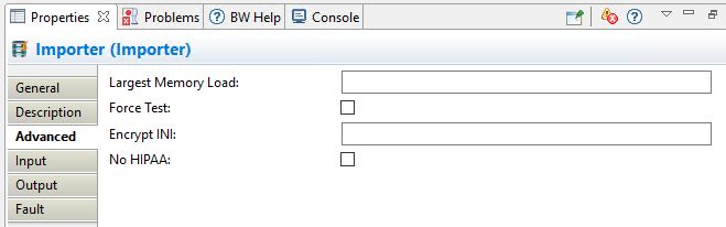 The configuration properties are grouped under tabs such as General, Description, Input, Output, and so on. For example, upon adding an Importer activity, you can configure it by specifying the values for the properties under the tabs General, Description, Advanced, and Input, and view results using Output and Fault.