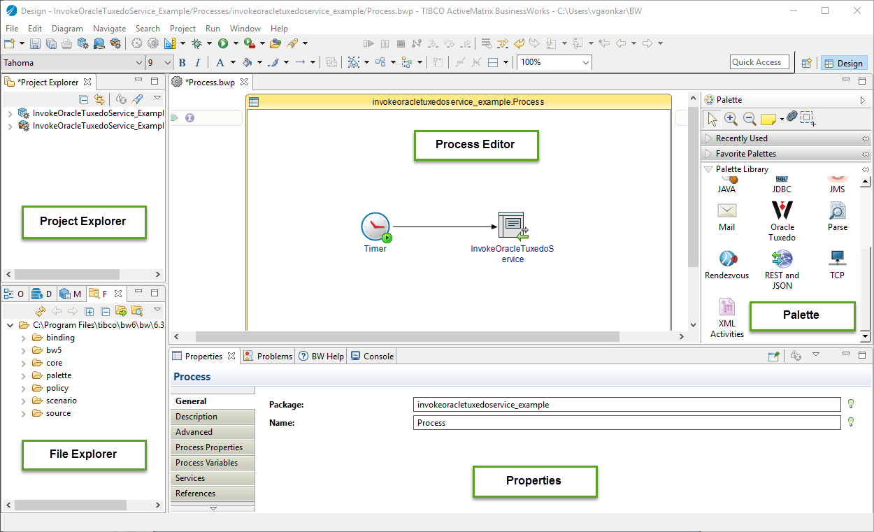 - Editor: provides a canvas to configure, edit, or browse a resource. Double-click a resource in a view to open the appropriate editor for the selected resource. For example, double-click a BusinessWorks process (Process.bwp) in the Project Explorer view to open the process in the editor.