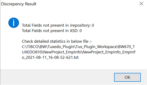Note: The summary shown on the pop-up screen only shows discrepancies where a field exists in XSD but not in Jolt Repository and vice versa. The generated file contains more information concerning discrepancies in field IDs. To check for incorrect field IDs, execute the Refactor process available in TIBCO Business Studio.