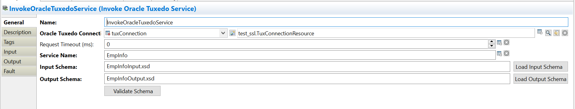 General tab, you can specify the reference to the Oracle Tuxedo Connection shared resource and XSD schemas related to the Oracle Tuxedo service invoked by the activity.