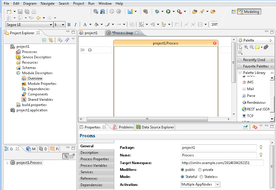 A project and an application are created and displayed in the Project Explorer view. The Process editor is opened automatically.