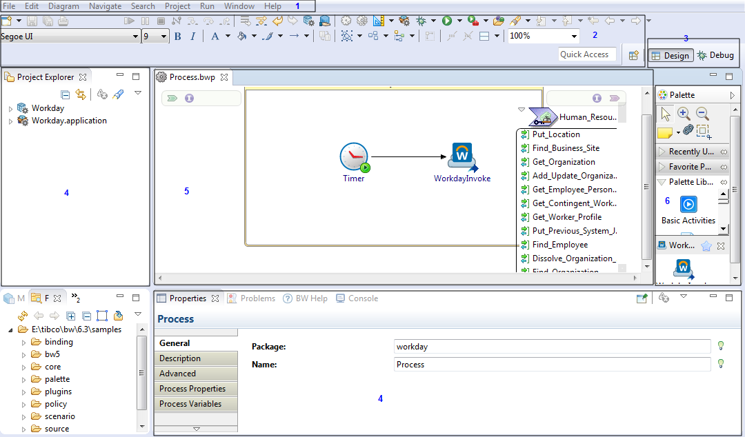 - Palette: contains a set of widgets and a palette library. A palette groups activities that perform similar tasks, and provides quick access to activities when configuring a process.