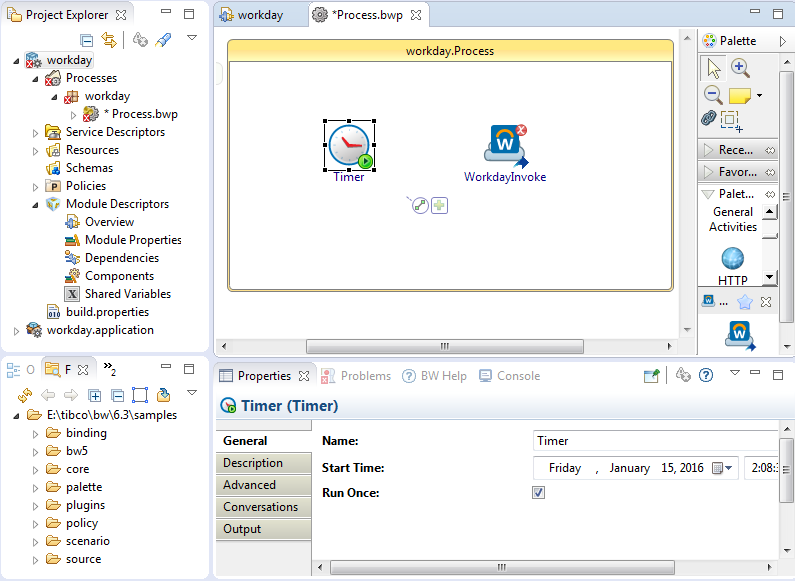 From the General Activities palette, select and drop a Timer activity to the process editor. From the Workday palette, select and drop a WorkdayInvoke activity to the process editor.