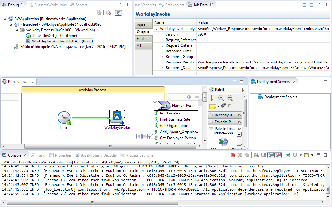 TIBCO Business Studio changes to the Debug perspective. The debug information is displayed in the Console view.
