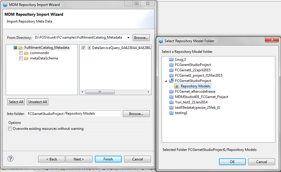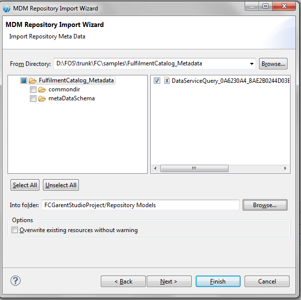 - Click Browse button beside the Into Folder field. The Select Repository Model Folder dialog opens. Select the Repository Models folder and click OK and then click Next.
