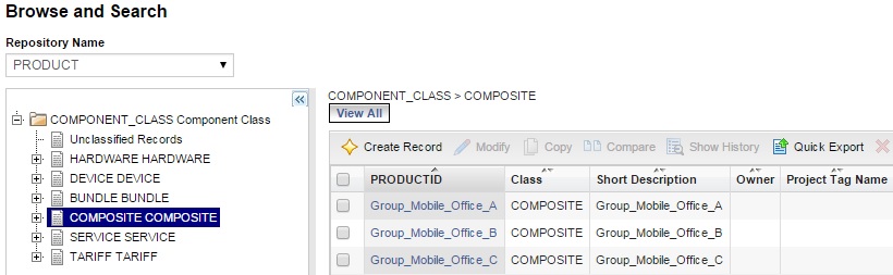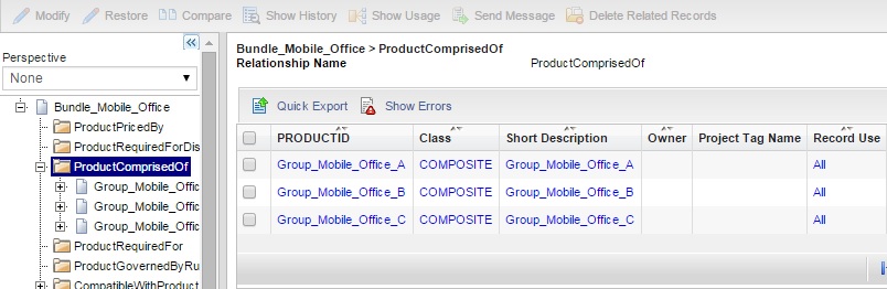 Products may also be composites of other products. In this example three Composite Groups have been created that is used later in a more complex Product Offering Bundle: