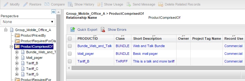 The composite groups themselves are not sellable offerings, but they are then used to define a more complex Product Offering (Mobile Office Bundle consists of three separate packages, represented by Groups A, B, and C). Note that at any level, additional compatibility or other rules may be added to further define the conditions for offering/purchasing the product: