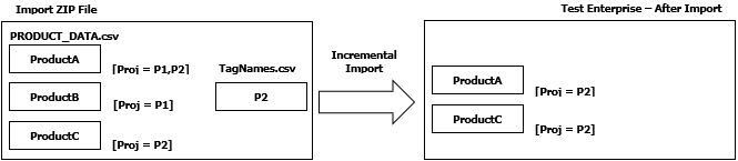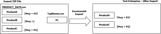 The Import zip file has repository records (for example, PRODUCT repository records) named ProductA, ProductB, and ProductC with the project tags [P1,P2], [P1], and [P2] respectively. The TagNames.csv file, which exists within the import zip file, has [P2]. Import the zip file to a Clean or New enterprise.