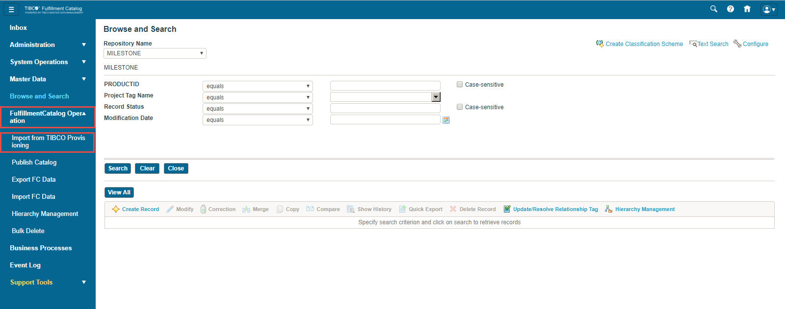 The Fulfillment Provisioning Catalog Synchronization process is initiated through a menu item TIBCO Fulfillment Catalog > Import from TIBCO Provisioning. This menu item is added to the menu only after the TIBCO Fulfillment Catalog is configured as a plugin for TIBCO MDM. For security reasons, the menu item is visible only to the user with the Administrator privileges. For any change in the access rule, refer to the Customizing Roles, Menus and Access Rights in the TIBCO MDM Customization Guide document.