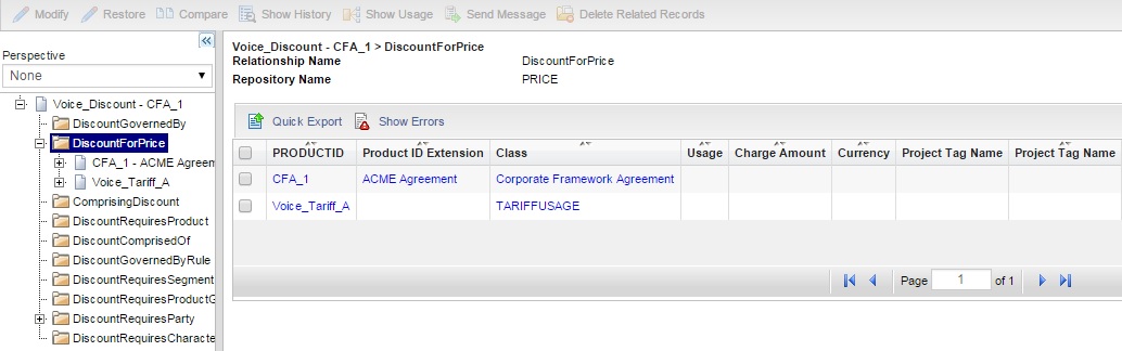 We now create a Price Discount object specific to ACME Worldwide and apply it to this group of Tariff Charges. We create a discount of 10 Percent for "Feature" charges (for example, use of the specified feature on the standard price object). We make the Discount require the Party "ACME Worldwide", and attach it to Voice_Tariff_A price object. Finally, we also add the discount to the CFA_1 Corporate Framework Agreement:
