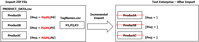 Because ProductB exists in the PRODUCT_DATA.csv file without the project tag [P2,P3], and ProductB exists in the enterprise with the project tag [P2,P3], the import process removes the project tag [P2,P3] from ProductB. Because there is no project tag for ProductB, it is deleted.