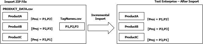 The Import zip file has repository records (for example, PRODUCT repository records) named ProductA, ProductB, and ProductC with the project tags [P4], [P5], and [P6] respectively. The TagNames.csv file, which exists within the import zip file, has [P1,P2,P3]. Import the zip file to an enterprise on which Step 1 has been performed.