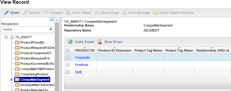 Segments are used to define conditions for Products or Prices. Tariff "TA_000017" is available to Post paid, Corporate, or SME Customers only