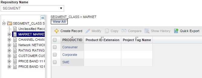 The list of defined Market Segments (Consumer, Corporate, SME)