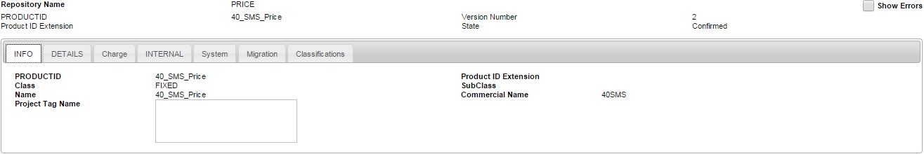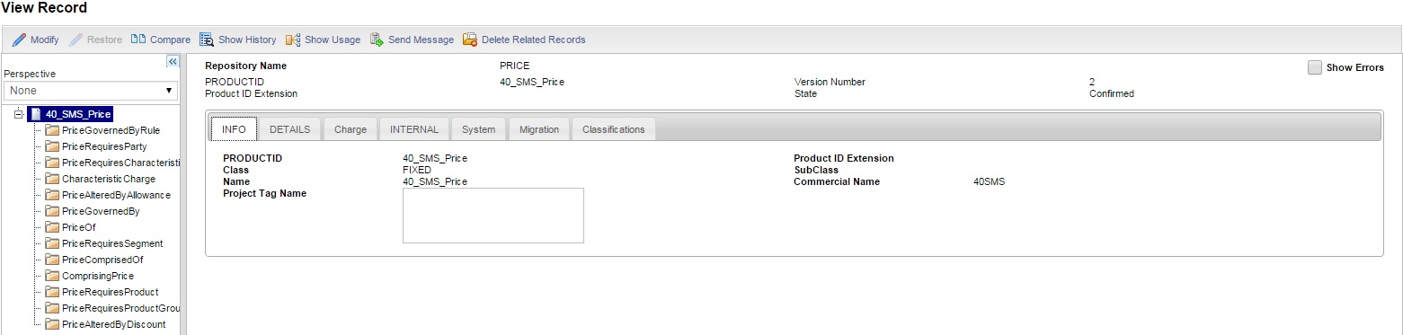 In the example below, the Service Product is modeled below, with the associated billing charge defined by the PRODUCTPRICEDBY relationship.