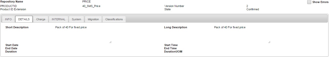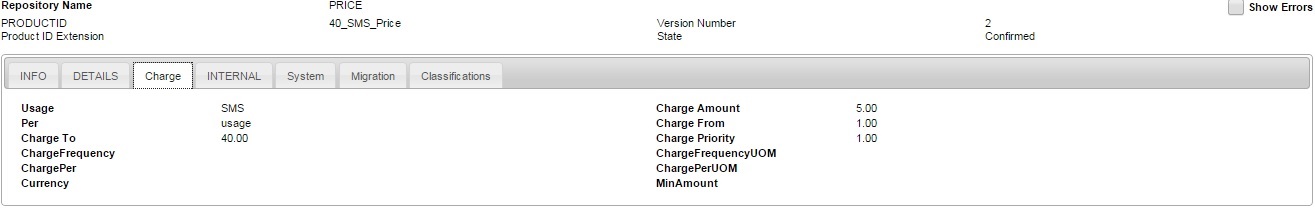 The Charge for the service is defined below. Note that the fixed charge of 5 Euros applies to the first 40 SMS messages, as defined by the "Charge From" and "Charge To" parameters. Also note that the Charge Priority of 1 means that this price overrides any other SMS charges that the customer may have on any other Tariffs: