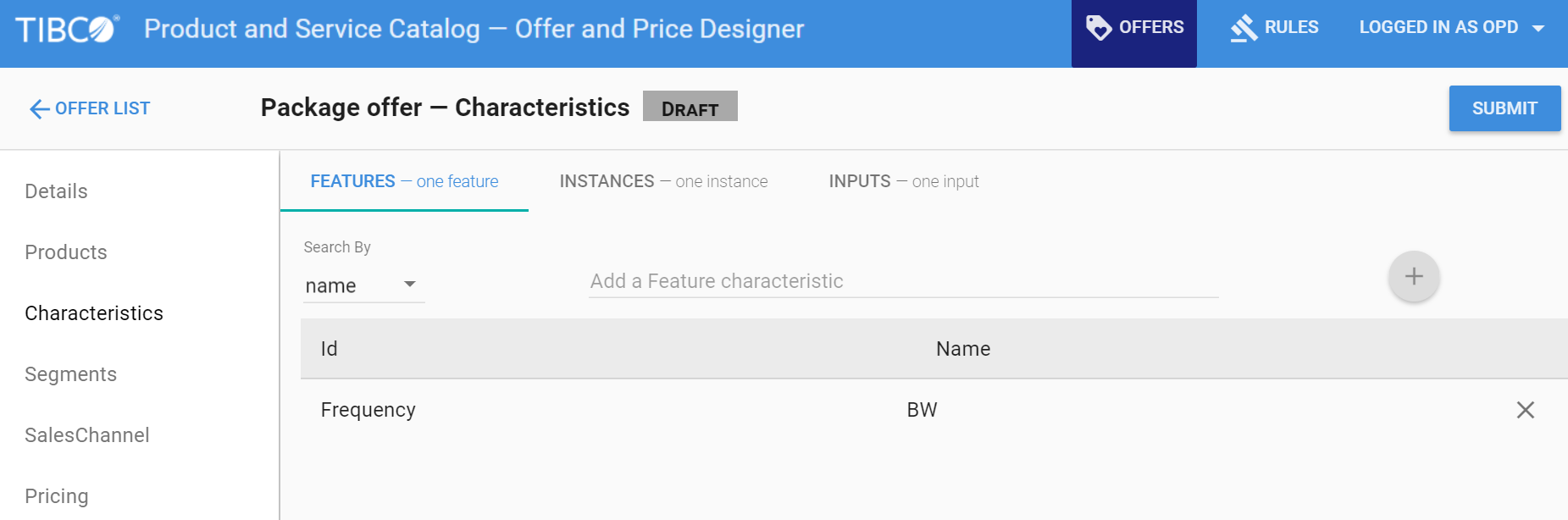 You can add characteristics to an offer only if it already exists in the TIBCO Product and Service Catalog enterprise. Contact the administrator to add characteristics in the TIBCO Product and Service Catalog enterprise.