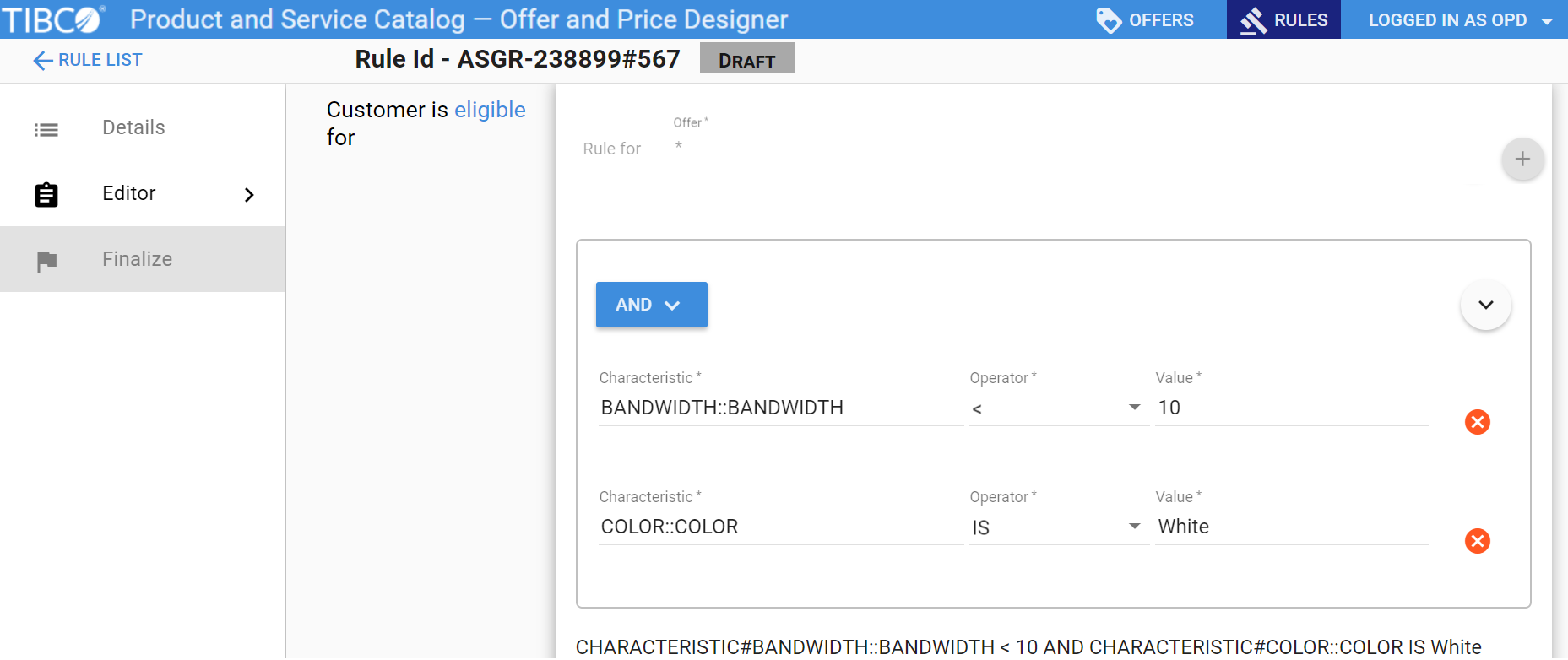 To add characteristic to the rule click