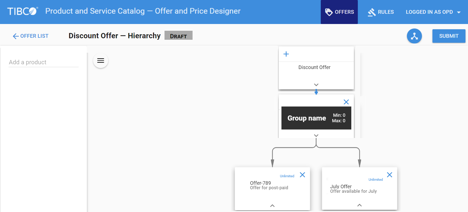 You can use the graph view to make modifications to the offer using drag and drop and other UI extensive elements.