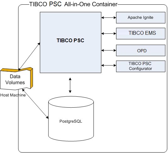 TIBCO PSC all-in-one container bundles components (TIBCO PSC, TIBCO PSC Configurator, JBoss Wildfly, PostgreSQL, Apache ActiveMQ, Apache Ignite, and PSC_OPD) as a single container. For the supported versions of these components, see the Readme.txt file of TIBCO PSC